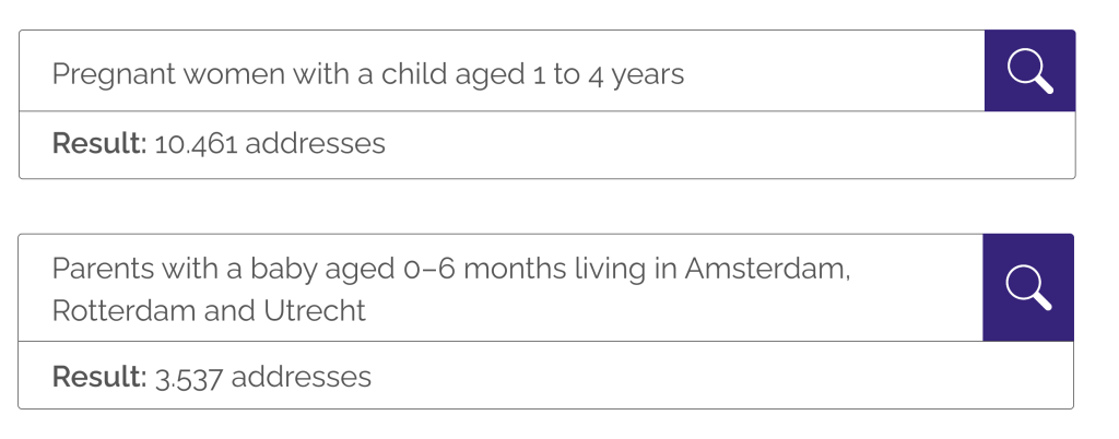 The WIJ Special Media database is built on carefully collected first-party data from expectant and new parents in the Netherlands. Consumers voluntarily and actively share information such as name, address, telephone, email, date of birth, due date, child’s date of birth, and gender.